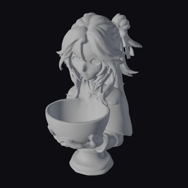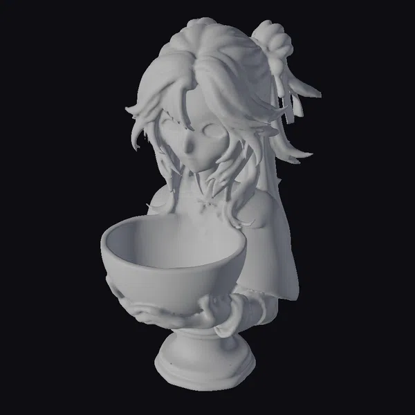 This intricately designed anime-style character bust features a young girl with a mesmerizing presence. Her pink hair is styled in a half-up bun, adorned with a maroon ribbon that matches her elegant outfit. The character’s red eyes are cast downward, focusing on the large, hollow white bowl she cradles in her hands. The bowl, resting on a pedestal, appears almost ready to be filled with an unknown treasure. The character’s maroon outfit is intricately designed with a subtle pattern, adding depth to her overall appearance. This model is perfect for use in games, 3D printing, VR/AR experiences, animation, and design projects, offering a unique and captivating visual element. The model’s detailed textures, precise lighting, and accurate proportions make it a high-quality addition to any project.