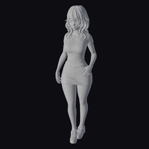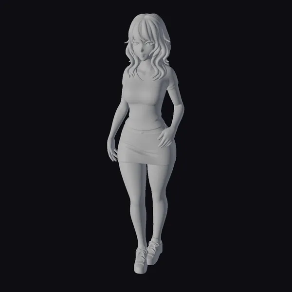Detailed with precision, this anime character model showcases a young woman with a dynamic pose, her right hand resting on her hip and her left arm relaxed by her side. Her attire consists of a black short-sleeved shirt with a distinctive design, a matching short skirt, and gray sneakers, all meticulously textured to give a realistic appearance. The model’s blonde hair is styled in loose waves, adding to her lively and approachable vibe. Her facial features are delicately crafted, with a slight smile suggesting a cheerful personality. This model is perfect for projects requiring a character with a casual, modern aesthetic, suitable for games, animations, virtual reality experiences, and more.