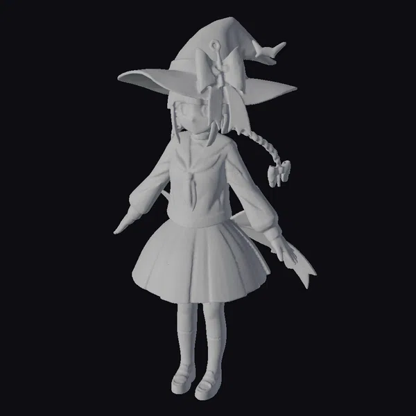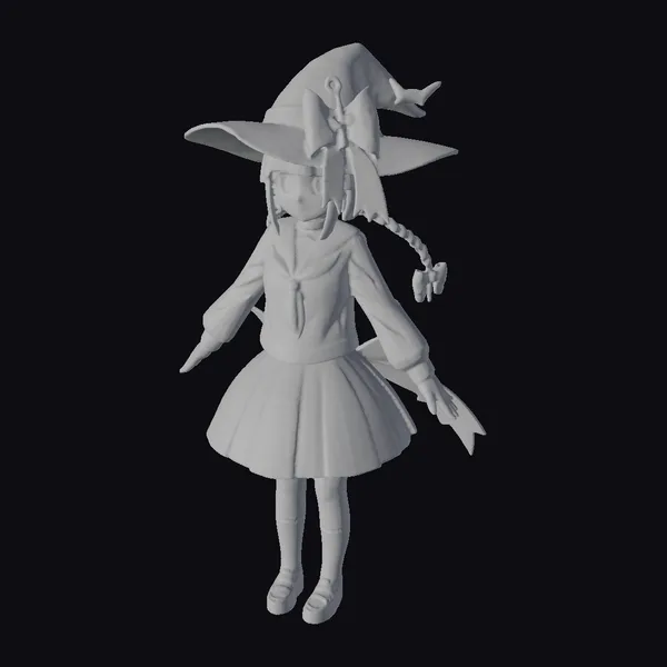 Detailed in every aspect, this 3D model showcases a delightful anime girl with intricate features. She stands confidently in a blue school uniform with white accents, complemented by a large blue hat that adds to her whimsical charm. The model boasts a high level of detail, from the texture of her clothing to the braided pigtails adorned with small red bows. Her facial features are sweet and inviting, with large expressive eyes and a gentle complexion. This model is perfect for projects requiring a touch of fantasy and playfulness, such as animations, games, or virtual reality experiences.