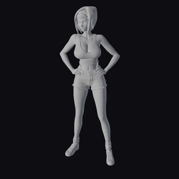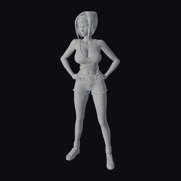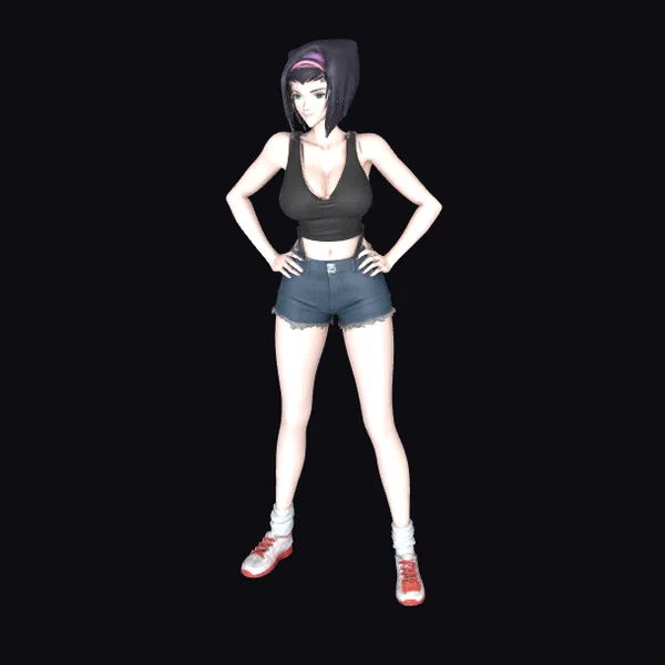 Detailed with precision, this 3D model captures the essence of anime artistry. The young woman stands tall, her hands on her hips, showcasing her casual yet fashionable outfit. The black tank top and blue denim shorts are meticulously textured, while her white and red sneakers add a burst of color. Her dark hair, complemented by a pink headband, and her expressive facial features, are finely detailed. The model is perfect for projects requiring a confident, youthful anime character, suitable for animation, game development, or virtual reality experiences.