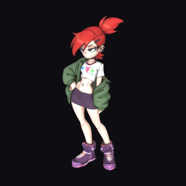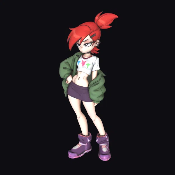 Detailed in every aspect, this stylized anime girl model showcases a dynamic pose with her hands on her hips, exuding confidence and playfulness. Her red hair is styled in a high ponytail, adding to her lively demeanor. The model features a green jacket draped over her shoulders, a white t-shirt with colorful graphics, a short purple skirt, and metallic purple boots that add a touch of edginess to her overall casual look. The model’s textures are smooth, with vibrant colors that bring out the cartoonish style. The lighting accentuates her form, making her ready for various applications such as animation, game development, 3D printing, or virtual reality experiences.