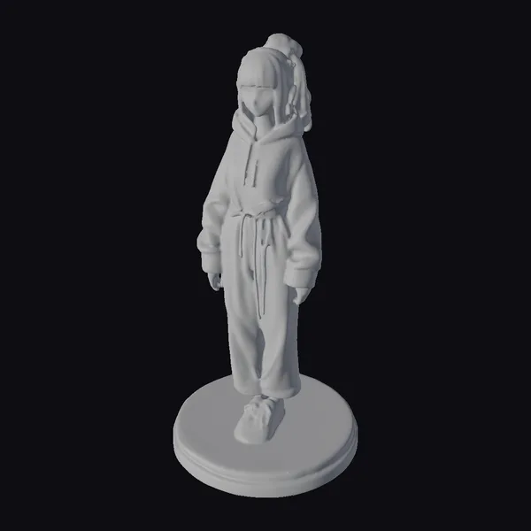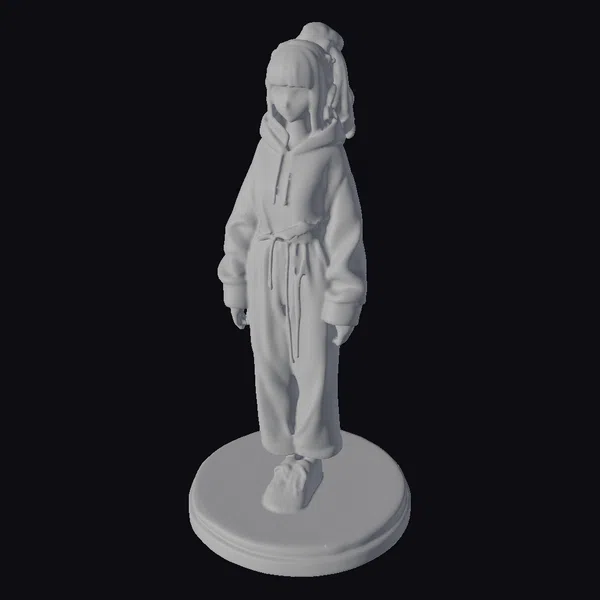 Standing on a detailed lifesized landscape base, this high-detail anime girl figurine is crafted with precision, showcasing a young girl dressed in a cozy white sweat suit. Her hair is styled in a fashionable bun, complementing her detailed facial features and serene expression. The figurine boasts a range of pastel colors, from the soft whites of her outfit to the gentle hues of her hair and skin. The solid infill and high-quality materials ensure durability, making it suitable for various applications, including games, print, VR/AR, animation, and design. The intricate details, such as the folds of her clothing and the texture of her hair, highlight the craftsmanship that goes into creating this piece.