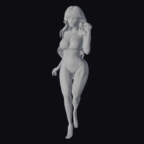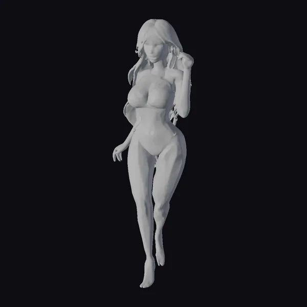Detailed with precision, this stylized anime girl boasts a curvy physique, accentuated by her white bikini that glistens with a subtle sheen. Her long, flowing blonde hair cascades down her back, framing her face with loose strands. The action pose captures a moment of carefree movement, with one hand gently touching her hair and the other relaxed by her side. Her facial features are delicately rendered, with a soft expression that adds to her allure. Textured with a blend of smooth and soft materials, she radiates a warm, inviting glow. Ideal for projects in games, animation, or 3D printing, this model is crafted to bring a touch of stylized realism to your creations.