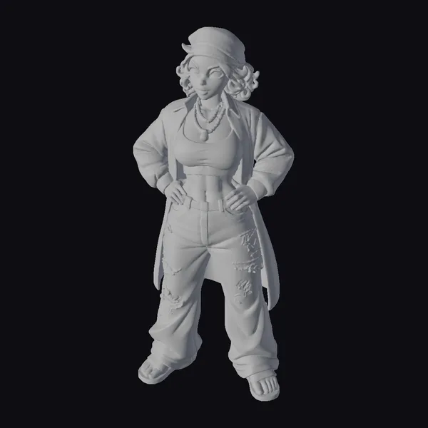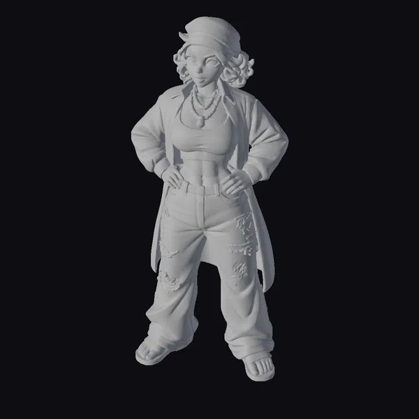 Detailed with precision, this anime-style female character model showcases a dynamic pose with hands on hips, wearing a colorful ensemble consisting of a rainbow plaid shirt, pink crop top, distressed blue jeans, and black flip-flops. The model’s curly dark hair and brown eyes are accentuated by gold hoop earrings and layered necklaces. The character’s outfit is completed with a matching colorful hat. This model is ideal for projects requiring a lively, modern anime character, suitable for animation, games, print media, VR/AR experiences, and design projects.