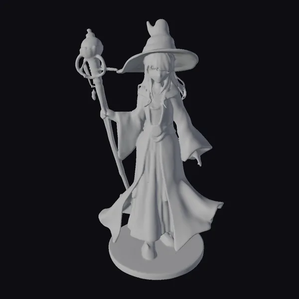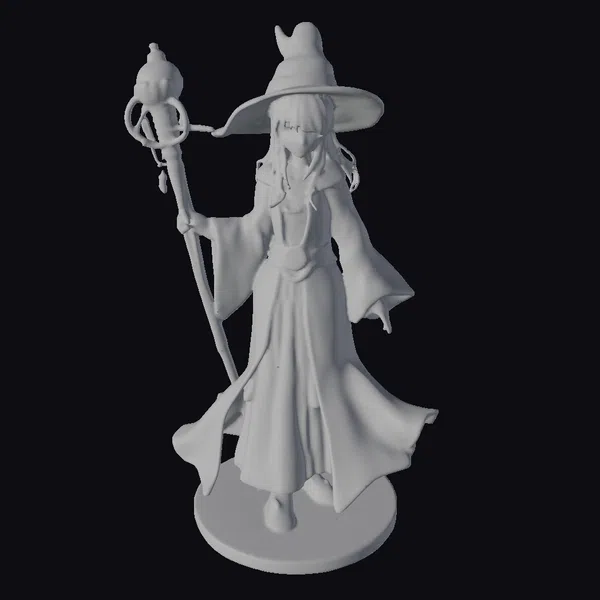 Standing tall on a sturdy base, this exquisite figurine captures the essence of a powerful witch with a poised stance, her dark hair cascading under a pointed hat that mirrors the mystical aura of her being. The robe, a masterful blend of purple and gray hues with golden filigree, flows elegantly around her, suggesting movement even in stillness. The staff in her hand, topped with an orb of light, seems to hum with magical energy. Crafted with meticulous attention to detail, this model is perfect for those who appreciate the allure of fantasy and the intricate details of anime art. Ideal for use in games, 3D printing, VR/AR experiences, animation projects, and design visualizations.