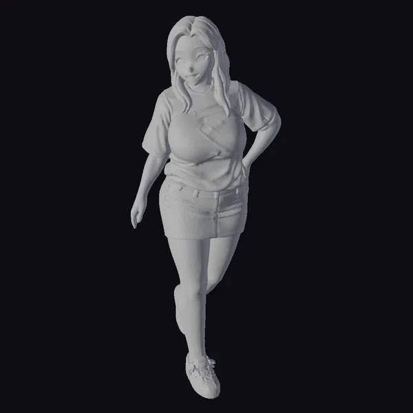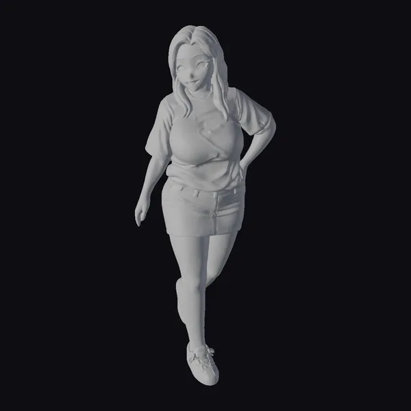 Detailed in every aspect, this anime-style woman stands out with her casual yet captivating appearance. Her pose, with one leg slightly bent and hand on her hip, exudes confidence and charm. The light blue and black t-shirt hugs her figure, complemented by a short denim skirt and white sneakers that add a sporty touch. Her facial features are delicately rendered, with a soft smile and expressive eyes that bring her to life. The long, dark hair flows down her back, framing her face elegantly. This model is perfect for projects requiring a stylized, modern character, suitable for animation, games, virtual reality experiences, or design projects.
