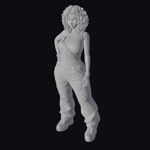 Detailed with precision, this stylized anime woman boasts a dynamic pose, complete with one hand on her hip and the other relaxed by her side. Her outfit consists of distressed blue overalls paired with a black tank top and black-and-white sneakers, exuding a casual yet stylish vibe. The model’s curly black hair and expressive makeup add to her allure, making her a versatile asset for various projects, from game development to animation and design.