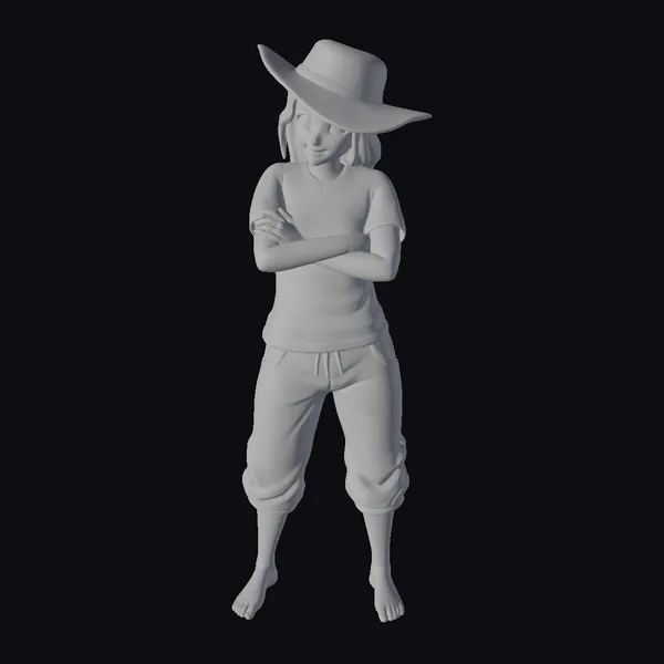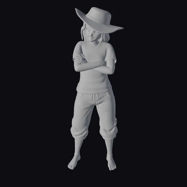 Detailed with a keen eye for vibrant colors and dynamic posing, this 3D model captures a young woman in a quintessential anime style. She stands with her arms crossed, donning a bright yellow short-sleeved t-shirt, pink rolled-up pants with purple accents, and a casual tan hat. Her dark hair peeks out from under the hat, framing her face with a subtle, playful expression. The model’s pose and attire evoke a sense of casual confidence, perfect for projects requiring a lively, cartoonish character. Suitable for animation, game development, virtual reality experiences, or any creative project in need of a spirited anime character.