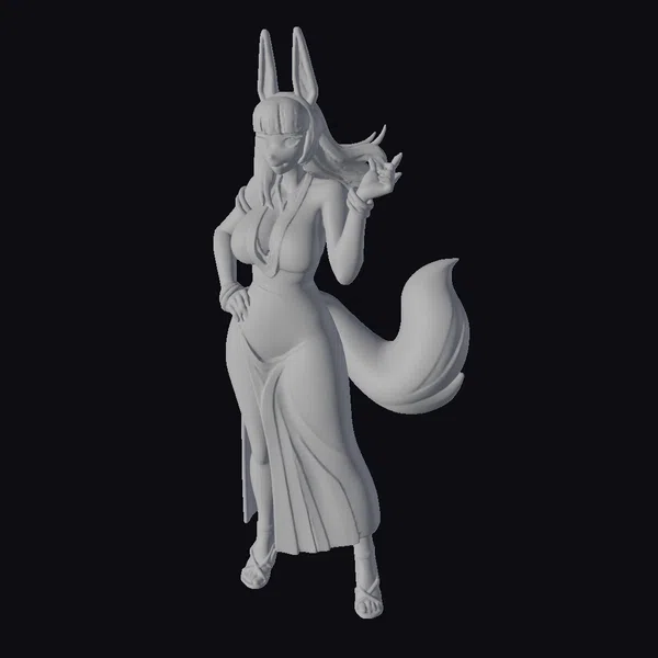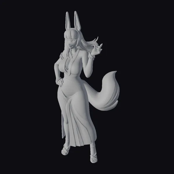 Detailed with precision, this stylized 3D model showcases an anthropomorphic fox woman in a pose that exudes confidence and poise. Her slender yet curvaceous body is draped in a dark, flowing dress that contrasts beautifully with her light blue-gray fur. The model’s facial features are meticulously crafted, with sharp, pointed ears and a fluffy tail that adds a dynamic element to her overall appearance. Her long brown hair cascades down her back, framing her green eyes that seem to gleam with an inner light. Adorned in gold jewelry, including a necklace and multiple bracelets, she embodies a sense of luxury and sophistication. This model is ideal for projects requiring a unique blend of fantasy and glamour, such as animations, games, or virtual reality experiences.