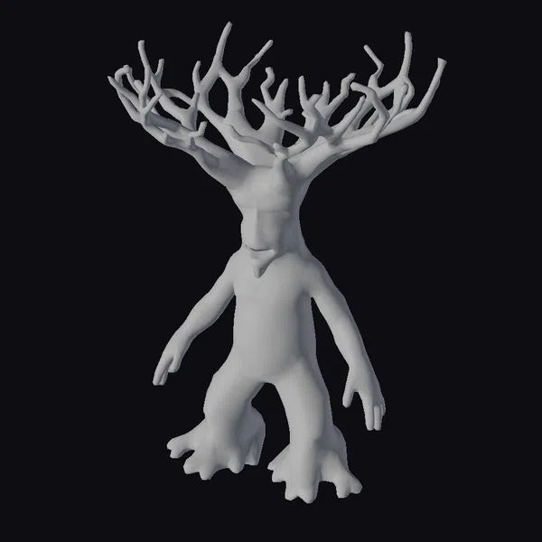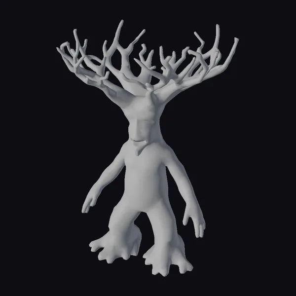 Gazing upon this intricately detailed model, the pose and textures transport you to an enchanted realm. The creature’s body, resembling the trunk of a Baobab tree, transitions smoothly into human-like limbs, culminating in hands and feet that echo the ruggedness of tree roots. The face, carved into the trunk, presents a serene expression. The branches on its head, some bare and others with green shoots, suggest a life force intertwined with nature. This model is perfect for projects requiring a mystical or fantasy element, such as animations, games, or architectural visualizations that aim to blend the organic with the imaginative.