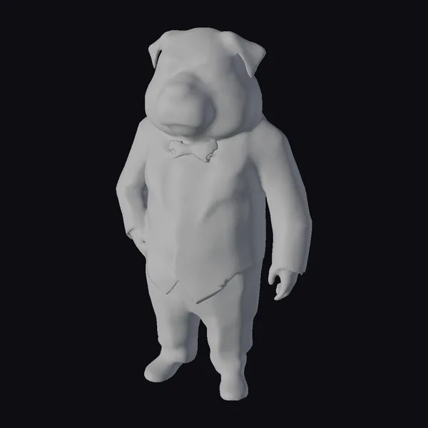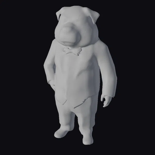 In a striking pose, the pug’s expressive face is front and center, with a calm demeanor that belies its comical appearance. The tuxedo is meticulously detailed, from the shiny black fabric to the subtle sheen on the buttons and bow tie. The model’s body is proportioned to emphasize the pug’s features, creating a delightful contrast between the canine head and humanoid body. Ideal for use in animations, games, or designs where a touch of humor and elegance is needed, this model is sure to charm audiences. Its high-quality design ensures it will integrate seamlessly into various projects, from character designs to advertisements.