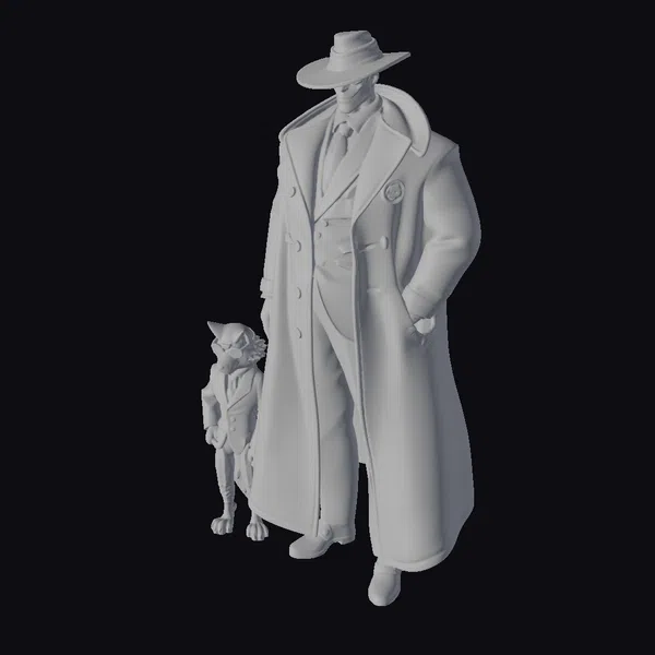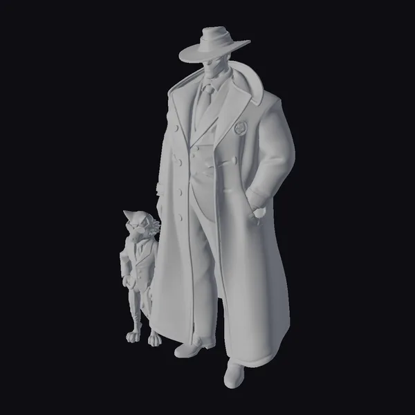 Detailed with precision, this 3D model showcases a man and an anthropomorphic wolf standing side by side, both sporting matching blue detective outfits. The man wears a long, buttoned coat with a badge on his chest, complemented by a wide-brimmed hat and black shoes. The wolf, equally stylish, dons a miniature version of the detective attire. Their expressions exude a sense of determination and readiness to solve any mystery. The model’s stylized yet detailed appearance makes it perfect for projects requiring a touch of fantasy and detective work, such as animations, games, or graphic designs.