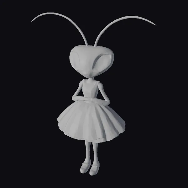 Delicately posed with her hands clasped in front of her, this endearing mantis girl exudes a sense of shy elegance. Her slender, elongated body is adorned in a lovely pink and white floral dress that complements her soft, greenish-yellow complexion. The dress features a vibrant floral pattern, adding a touch of playfulness to her overall appearance. Her large, dark eyes are cast downward, giving her an air of modesty. Long, thin antennae-like protrusions extend from her head, adding to her insectoid charm. This stylized character model is perfect for use in games, animations, or designs that require a whimsical, fantastical element. The intricate details, from the texture of her skin to the folds of her dress, make her a delightful addition to any project.