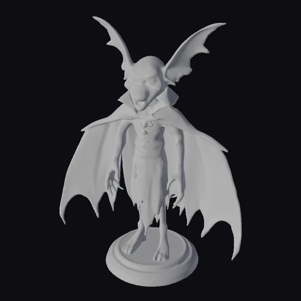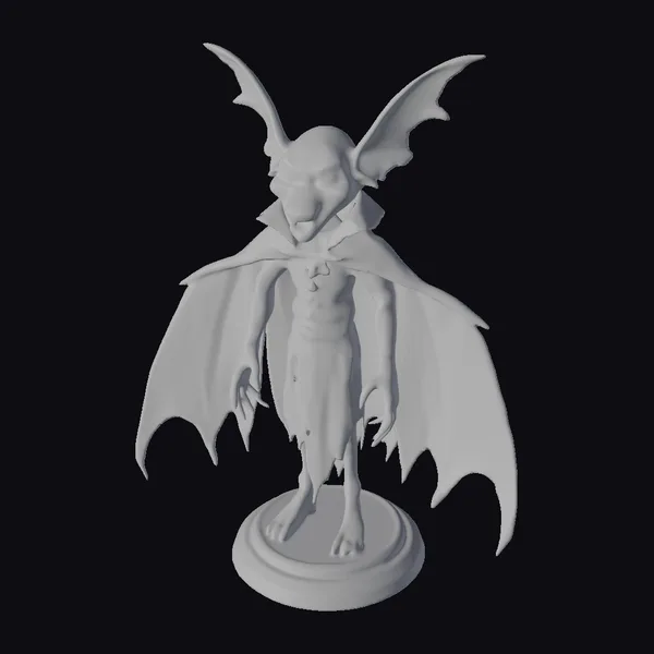Standing tall on a small round base, this intricately designed figurine captures the eerie essence of a vampire bat elder. Its bald head, accentuated by large, pointed ears and a wide, toothy grin, sits atop a humanoid body draped in a flowing black cape with a distinctive red belt. The model’s texture and lighting emphasize its bat-like features, from the wings sprouting from its back to the sharp claws on its feet. Ideal for use in games, 3D printing, VR/AR experiences, animation, and design projects, this model brings a touch of gothic horror to any creative endeavor.