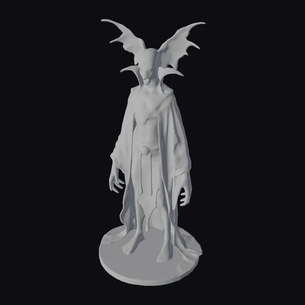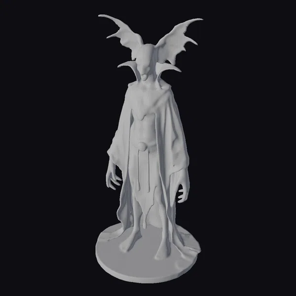 Standing tall on a small round base, this intricately detailed figurine showcases an anthropomorphic vampire bat with an unsettling presence. The creature’s pale skin is contrasted with dark, leathery wings and a tattered black cloak. Its skeletal face, complete with sunken eyes and sharp fangs, seems to leer directly at onlookers. The exposed torso, adorned with visible muscles and a hint of blood, adds a layer of macabre realism. This model is perfect for use in dark fantasy settings, horror-themed projects, or as a striking decorative piece. Its versatility makes it suitable for various applications, including games, 3D printing, VR/AR experiences, animation, and design projects.