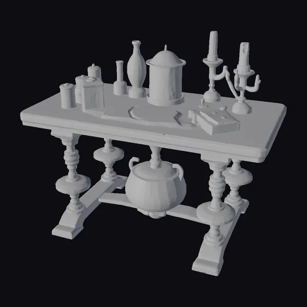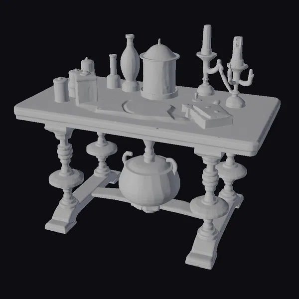 Perched on ornate legs, this richly detailed wooden table presents a captivating arrangement of antique items, including a lit candle lantern, candelabra with white candles, various bottles, jars, and containers that exude a sense of history. The textures of the wood and metal elements are meticulously rendered, inviting the viewer to explore every nook. The soft glow of the candlelight casts a warm ambiance, making this scene perfect for projects requiring a touch of nostalgia or a vintage aesthetic. Ideal for use in games, 3D printing, VR/AR experiences, animations, or design projects where a classic, timeless feel is desired.