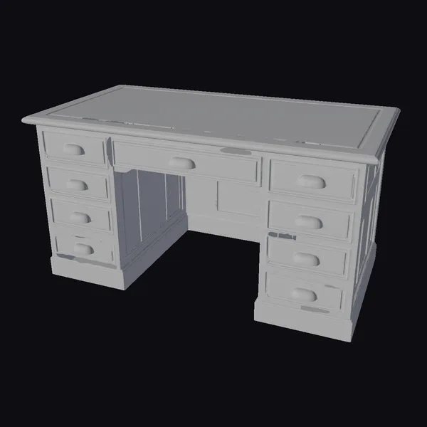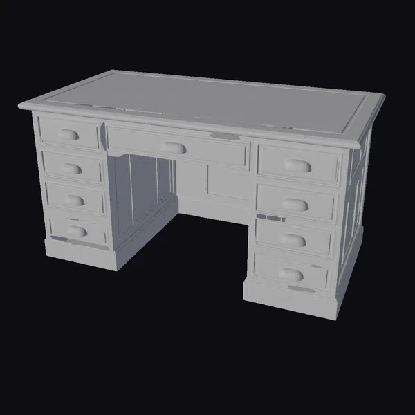 Positioned at a slight angle, the desk showcases its beautifully crafted wooden surface, adorned with a rich, swirling pattern that adds to its antique allure. The pedestal design offers a spacious workspace with a central opening, flanked by several drawers on each side, complete with classic oval-shaped handles. The wood, with its warm, honey-brown hues and subtle grain, suggests a piece that has aged gracefully, bringing a sense of history and sophistication to any setting. Whether for a home office, study, or as a statement piece in a larger room, this desk is versatile and sure to impress. Its detailed texture and realistic appearance make it ideal for 3D rendering projects, interior design visualizations, or even animation and game environments where a touch of classic realism is desired.