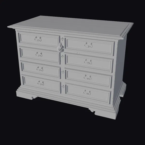 Crafted with meticulous attention to detail, this 3D model of an antique six-drawer wooden dresser presents a stunning visual experience. The dresser stands with a slight angle, revealing its depth and texture. The wooden surface exhibits a warm, honey-brown color with subtle grain patterns, while the drawers are accentuated with ornate metal handles and a central, golden lock. The dresser’s base features a decorative molding, adding to its classic appeal. This model is perfect for use in interior design projects, historical reconstructions, or as a decorative piece in 3D environments. Its high level of detail makes it suitable for close-up shots or animations.