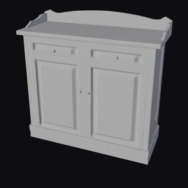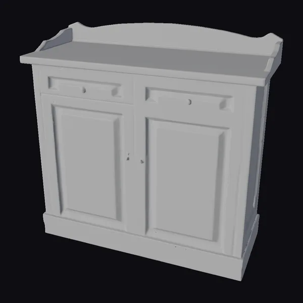 Crafted with meticulous attention to detail, this 3D model of an antique wooden cabinet showcases a beautifully weathered dark wood finish, complete with subtle signs of aging and wear. The cabinet’s design is characterized by two doors with brass handles and two drawers above, each adorned with simple yet elegant brass knobs. A decorative brass trim runs along the top edge, adding a touch of sophistication. The cabinet’s proportions are perfectly captured, from the raised panel doors to the slightly curved back panel. This model is ideal for use in interior design projects, historical reconstructions, or as a decorative piece in games and animations. Its high level of detail makes it suitable for close-up shots or as a background element.