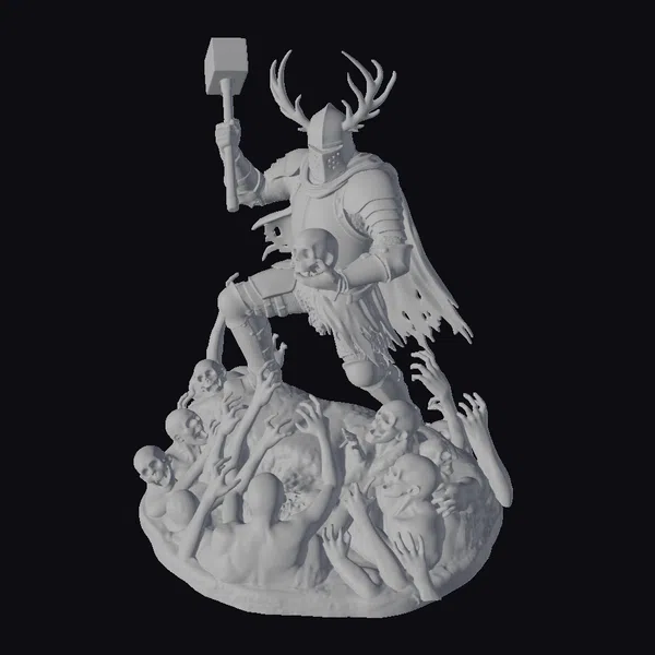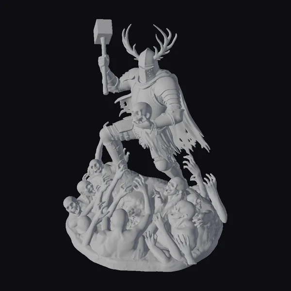 This imposing figure stands tall, its dark armored body accentuated by the eerie glow of gold antlers that sprout from its helmet, casting a mystical aura. The knight grasps a substantial hammer in one hand and a human skull in the other, symbolizing its dominance over the undead. At its feet, a chaotic mass of skeletal bodies stretches out in various poses of despair and terror, adding to the scene’s dramatic intensity. Crafted with meticulous attention to detail, this model showcases intricate textures and a dynamic pose, making it an excellent choice for projects requiring a dark, medieval fantasy element. Ideal for use in games, 3D printing, VR/AR experiences, animations, and designs that demand a touch of the macabre.
