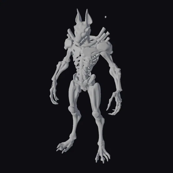 Standing tall with an air of foreboding, this skeletal Anubis boasts a meticulously crafted, metallic body that showcases a blend of H.R. Giger’s signature biomechanical style and ancient Egyptian mythology. The creature’s pose, with arms slightly bent and claws extended, suggests a readiness to pounce. Its dog-like skull, complete with pointed ears, sits atop a ribcage and spine that seem to be made of a dark, industrial metal. The texture of the model, with its subtle shading and lighting, adds depth to its already imposing presence. This model would be a striking addition to any project requiring a dark, mythological, or sci-fi element, particularly in games, animation, or VR/AR experiences aiming to evoke a sense of horror or unease.