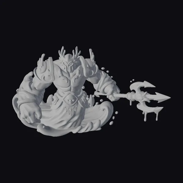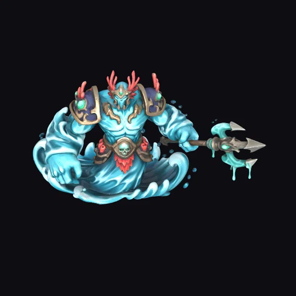Detailed with precision, this fantasy creature stands with a muscular physique, its blue body rippling with water effects that suggest movement and energy. The creature’s face is framed by red protrusions, adding to its fearsome appearance. Adorned in gold-trimmed purple armor and a distinctive red and silver skull belt, it grips a trident that seems to be an extension of its watery power. The model showcases intricate textures, from the sheen on its armor to the flow of water around it. Ideal for use in games, animation projects, virtual reality experiences, or as a unique design element, this model brings a touch of aquatic fantasy to any creative project.