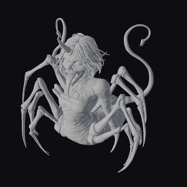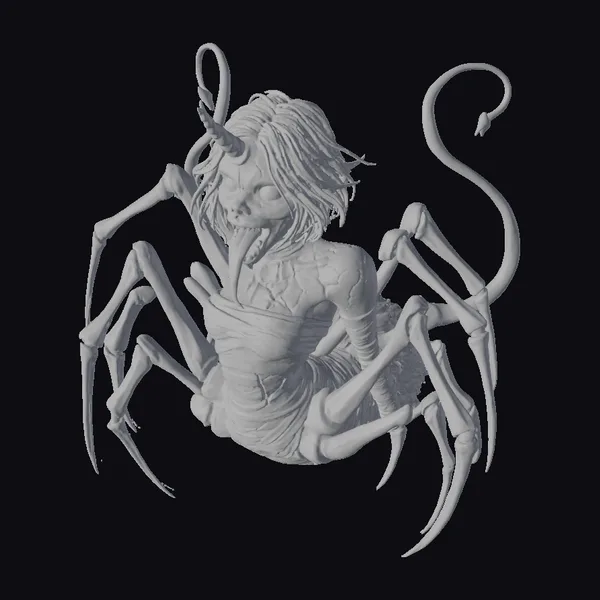 Deep in the shadows, a terrifying arachnid enchantress emerges. Her humanoid upper body, with eerie gray hair and a protruding tongue, merges with the menacing lower body of a spider. The contrast between her pale skin and dark, skeletal legs creates a chilling effect. A small, golden horn adorns her forehead, adding a touch of mystique to her fearsome appearance.