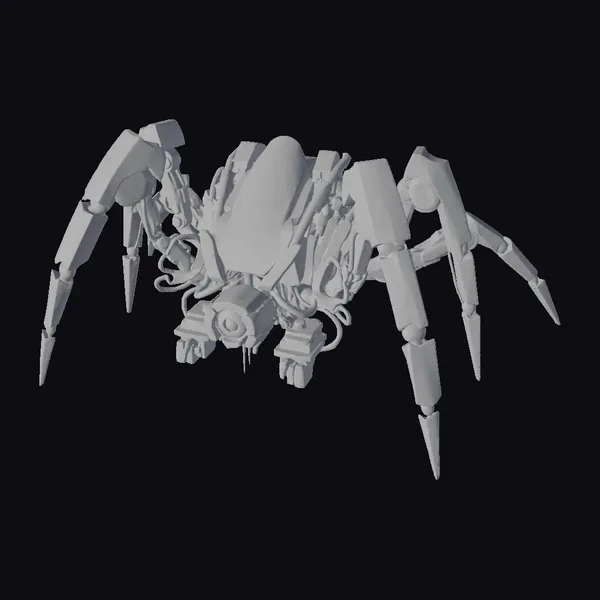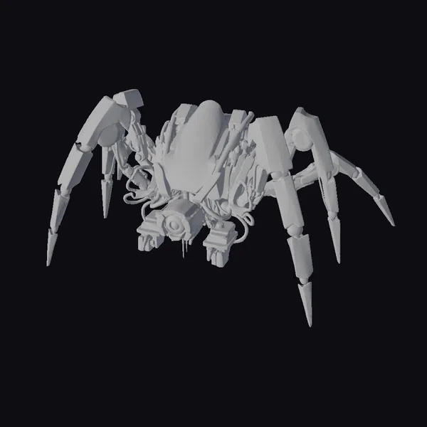 Perched menacingly, this arachnobot sentinel boasts a complex arrangement of metallic plates and wires, with sharp, pointed legs splayed out in a threatening posture. The predominantly gray body is accentuated by vibrant red details and glowing red eyes, suggesting advanced technology and a formidable presence. The model’s intricate design, complete with visible joints and mechanical components, invites detailed examination. Ideal for use in sci-fi projects, gaming environments, or as a striking visual element in design and animation work.