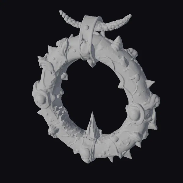Crafted with meticulous detail, the pendant’s gray stone surface is punctuated by jagged spikes and a richly textured appearance. Four gold settings proudly display pink gemstones, while a central blue crystal adds a pop of color. The braided cord, complete with two curved horns, adds a touch of whimsy. This pendant is perfect for those who appreciate dark fantasy aesthetics, making it an excellent choice for game characters, 3D animations, or as a unique design element. Its intricate design and bold colors ensure it will be a focal point in any setting.