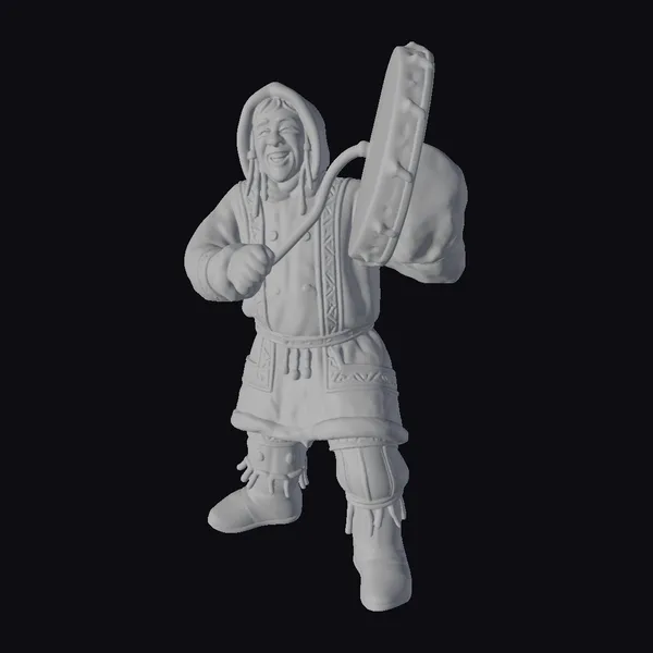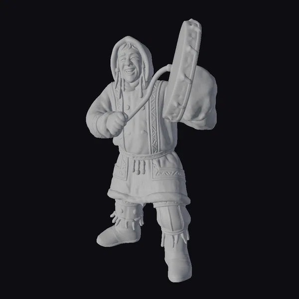 The arctic drummer stands with a dynamic posture, his mouth wide open in a hearty laugh. He wears a predominantly dark brown, fur-trimmed coat with striking white patterns that reflect traditional arctic designs. The coat is complemented by matching pants and boots, all adorned with fur and detailed patterns. In his hands, he holds a substantial drum with a sturdy stick, poised as if mid-beat. The textures of the fur and the drum are meticulously rendered, capturing the rugged yet cultural essence of arctic attire. This model is perfect for projects requiring a vibrant, culturally-inspired character, suitable for animation, game development, or virtual reality experiences.
