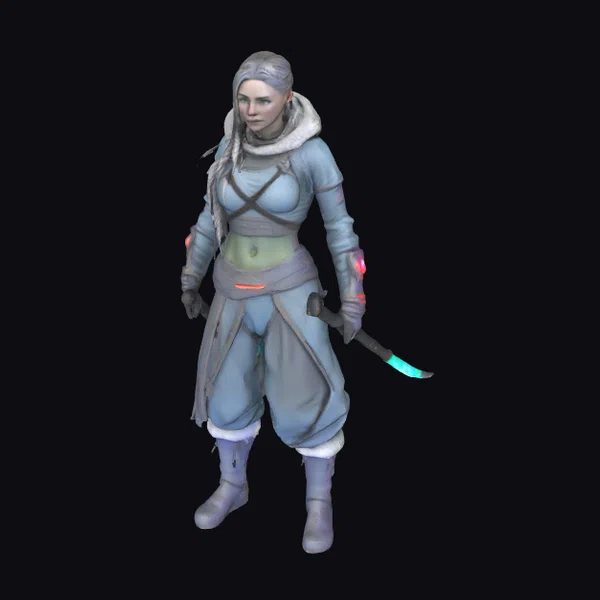 Standing tall with a confident stride, the Arctic Huntress is a vision of futuristic combat prowess. Her long, braided hair flows like the aurora borealis, complemented by a hood that frames her determined expression. The intricate details of her outfit reveal a deep integration of technology and traditional warrior aesthetics – from the graphene armor mesh that offers protection without hindrance, to the micro-LED braids that illuminate her path in the darkest of environments. Her weapon, a curved sword with a glowing blue blade, seems an extension of her being, ready to strike at a moment’s notice. This 3D model is perfect for projects requiring a strong, futuristic female character – be it for game development, animation, or virtual reality experiences.