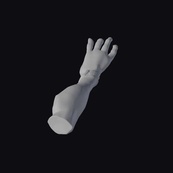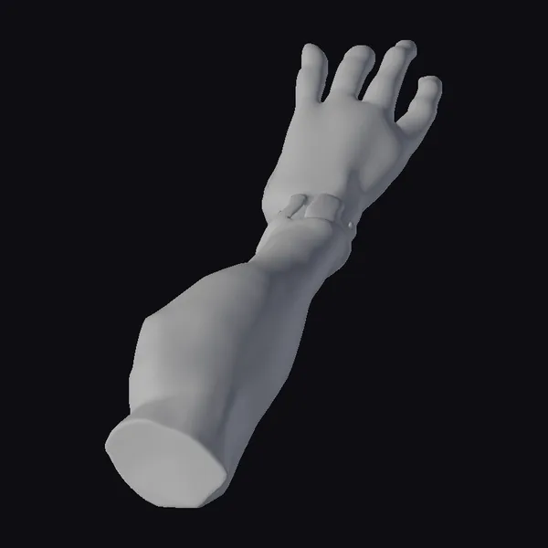 Positioned with the palm facing upwards, this 3D model of a human arm showcases a seamless blend of organic and synthetic elements. The arm itself boasts a highly detailed texture, complete with subtle wrinkles and creases that add to its lifelike appearance. A sturdy, metallic cuff encircles the wrist, its surface adorned with a subtle sheen that catches the light. The cuff’s design is both functional and visually striking, making it an excellent choice for projects requiring a futuristic or sci-fi aesthetic. Whether you’re working on a game, animation, or architectural visualization, this arm model is poised to bring a touch of realism and sophistication to your work.