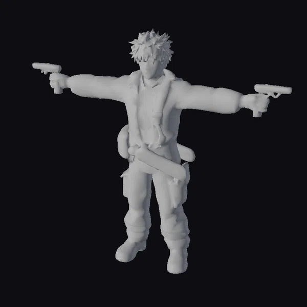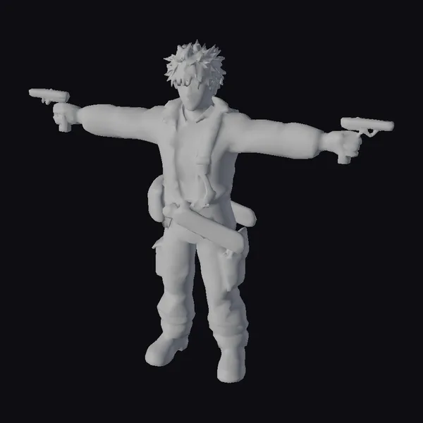 Detailed with precision, this character model showcases a white-haired individual donning a bold red jacket, complemented by a light grey shirt and brown pants. His arms are outstretched, each hand firmly grasping a gun, with a large knife secured at his waist. The model’s stylized features emphasize a dynamic, action-packed vibe, perfect for projects requiring a heroic or adventurous character. Textures and lighting enhance the overall visual appeal, suggesting use in games, animations, or virtual reality experiences where a ready-for-action character is needed.