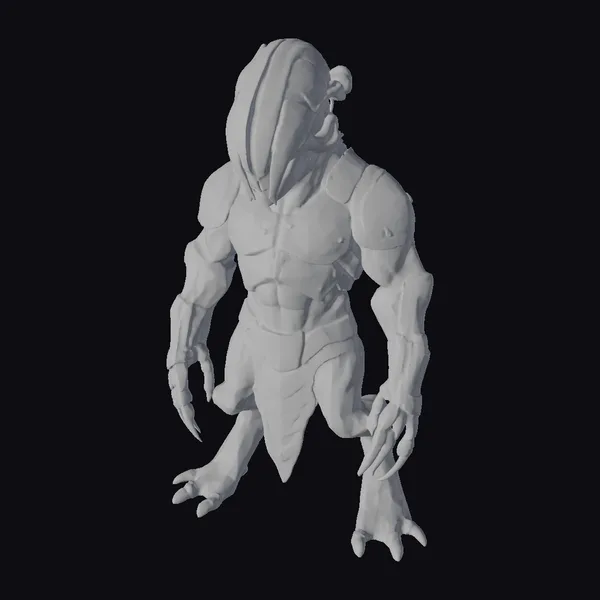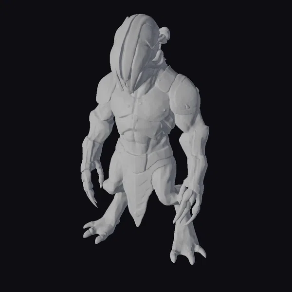 Standing tall with its imposing figure, this armored creature boasts a blend of organic and metallic features. Its body is covered in a mix of gold and silver armor plates, complemented by sharp, claw-like nails on its hands and feet. The helmet, shaped like a mix of beast and machine, adds to its intimidating presence. The creature’s muscular build and poised stance suggest readiness for battle. Ideal for projects requiring a dark fantasy or sci-fi element, this model can enhance games, animations, or designs with its unique blend of horror and heroism.