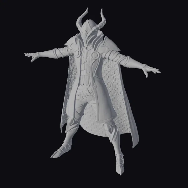 This imposing figure is captured in a dynamic pose, arms outstretched as if embracing the vastness of space or perhaps commanding the elements. The armor is a mesmerizing blend of deep blues and gold accents, with a cloak that shimmers with an iridescent glow, suggesting an otherworldly origin. The helmet, complete with curved horns, adds to the character’s formidable presence, evoking a sense of power and authority. The detailed textures and lighting effects enhance the model’s realism, making it suitable for high-quality game environments, virtual reality experiences, or detailed animations. Whether used in a sci-fi setting to represent a guardian of the galaxy or in a fantasy realm as a powerful sorcerer, this model is sure to leave a lasting impression.