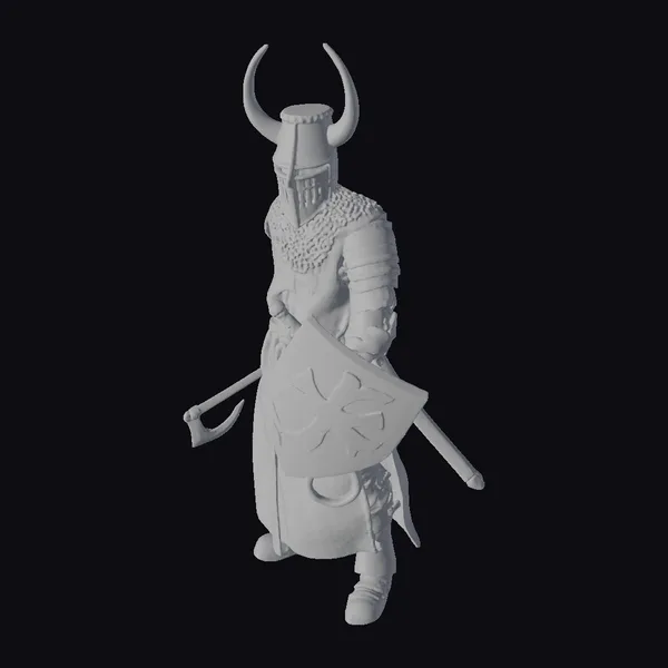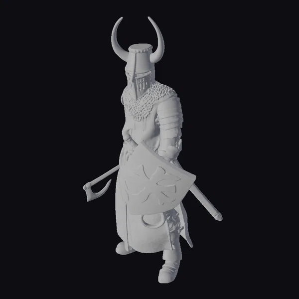 Standing tall in his imposing armor, this crusader knight exudes an aura of bravery and honor. His silver and white armor gleams with a sense of righteousness, complete with a distinctive horned helmet and a shield emblazoned with a black cross. The knight’s sword and axe at the ready, he appears prepared to face any challenge.