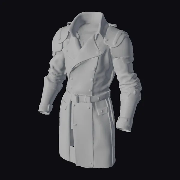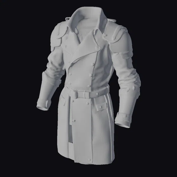In a stance that exudes battle-readiness, the armored coat features an elongated silhouette with a high collar and double-breasted front adorned with metallic rivets. The sleeves are protected by metallic armor, complemented by additional shoulder armor for enhanced defense. A sturdy belt cinches at the waist, emphasizing the coat’s practical yet formidable design. Textures suggest a balance of leather’s suppleness and metal’s unyielding strength. Ideal for projects demanding a blend of style and protection, such as game environments, animations, or detailed designs.