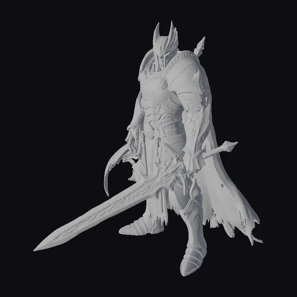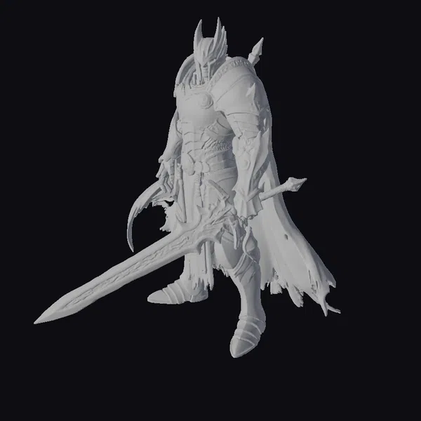 Standing tall with a powerful stance, this intricately detailed dark knight model showcases a blend of horror and heroism. The metallic armor, adorned with glowing blue accents, contrasts sharply with the dark cape flowing behind him. The knight’s helmet features pointed ears, adding to his mythical appearance. He grasps a large, glowing blue sword, ready for action. This model excels in dark fantasy settings, ideal for games, animations, or 3D printing projects that require a heroic yet eerie character.