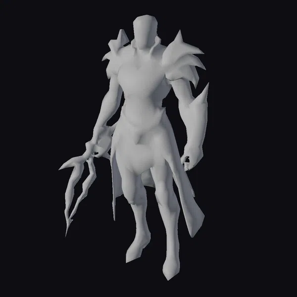 Detailed with precision, this armored dark knight guardian model showcases a robust and dynamic pose, highlighting the texture and shine of his metallic armor. The armor itself is a marvel of fantasy design, with protective plates covering his torso, arms, and legs, complemented by sharp, spiky shoulder guards. His facial expression is stern, adding to his heroic demeanor. The model comes with two weapons, each designed to appear as if forged from the very essence of darkness and steel, complete with sharp, threatening edges. The level of detail in the model, from the texture of the armor to the grip of the weapons, makes it suitable for a variety of applications, including game development, 3D printing, virtual reality experiences, and animation. Its versatility allows it to fit seamlessly into dark fantasy or superhero narratives, serving as a guardian, villain, or hero.