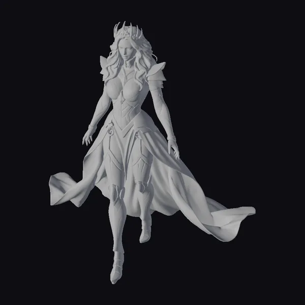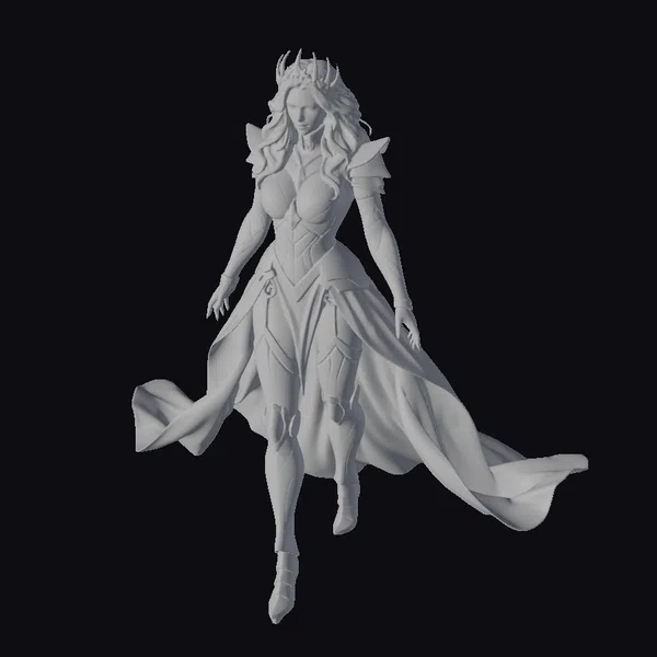 Standing tall with an air of confidence, this armored female warrior is a sight to behold. Her silver armor glistens with a subtle sheen, accentuated by gold accents that add a touch of luxury and power. A golden crown rests atop her head, signifying her royal status or perhaps her status as a guardian of magic. The armor covers her torso, arms, and legs, but a daring cut on her chest and thighs leaves some areas exposed, hinting at a blend of strength and elegance. A cloak of iridescent colors – blues, purples, and pinks – flows behind her, caught in a dynamic motion as if she is about to take flight. This model is perfect for projects that demand a character of strength, magic, and mystery, suitable for games, animations, VR/AR experiences, and detailed design work.