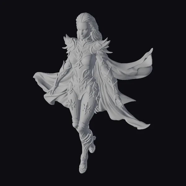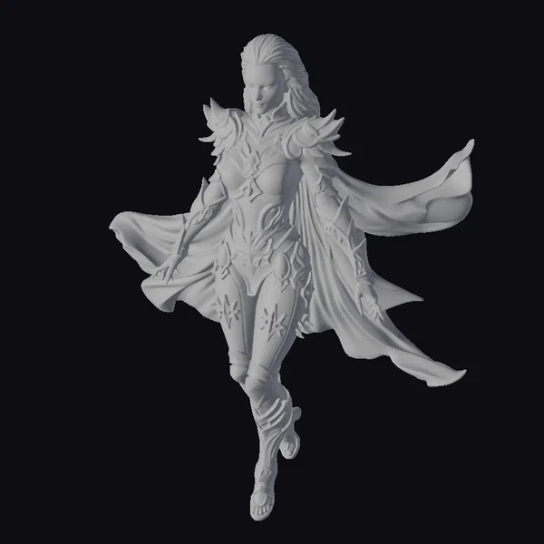 Rendered in exquisite detail, this armored female warrior exudes a sense of unstoppable force. Her long, blonde hair cascades down her back as she strides forward, her gaze fixed intently on the ground ahead. The metallic blue armor, adorned with intricate gold accents, covers her torso, arms, and legs, while a flowing cape with a soft, peach-colored interior flows dynamically behind her. The armor’s design is a blend of functionality and fantasy, featuring sharp, pointed protrusions that add to her formidable appearance. Ideal for use in games, animation, or 3D printing, this model brings a touch of epic fantasy to any project.