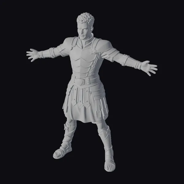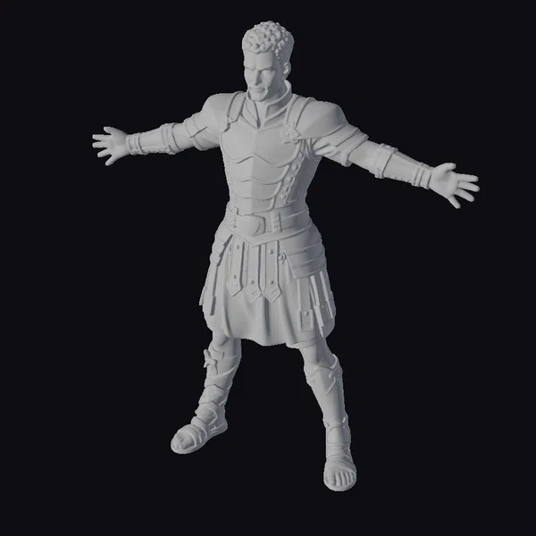 Standing tall with arms outstretched, this armored gladiator showcases intricate details in his silver and red armor, complete with a distinctive belt and sandals. The stylized model boasts a strong, heroic presence, perfect for use in games, animations, or 3D printing projects. His ancient roman-inspired design and dynamic pose evoke a sense of epic battles and legendary heroes.