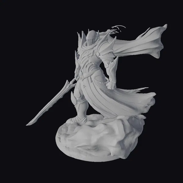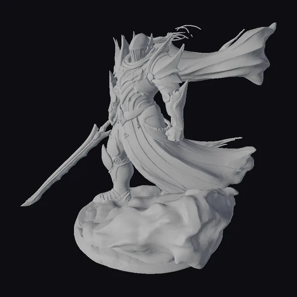 This meticulously crafted figurine showcases a knight in a powerful stance, poised atop a textured base that suggests a rocky outcrop. The armor, a blend of silver and gold, is adorned with spikes and intricate designs, reflecting light and adding to the knight’s imposing presence. A long cape flows from the shoulders, caught in the wind, while the knight grips a substantial sword, ready for combat. The model’s attention to detail, from the texture of the armor to the flow of the cape, makes it suitable for a variety of applications including games, 3D printing, virtual reality, and animation. Its fantasy roots and detailed execution make it a compelling addition to any project requiring a heroic or mythical character.