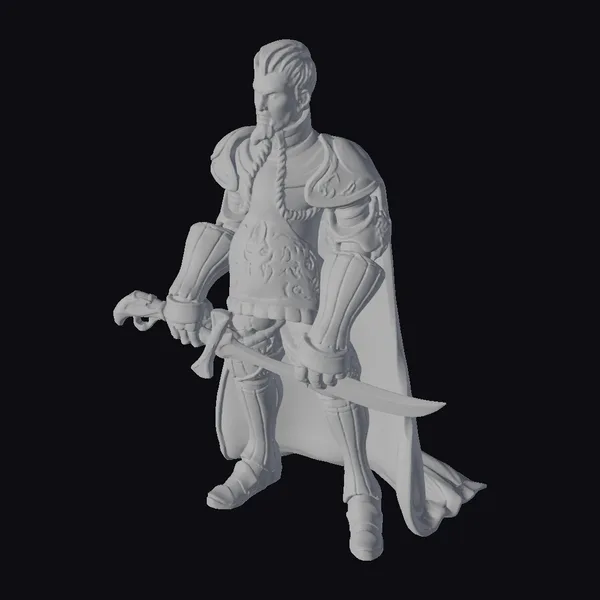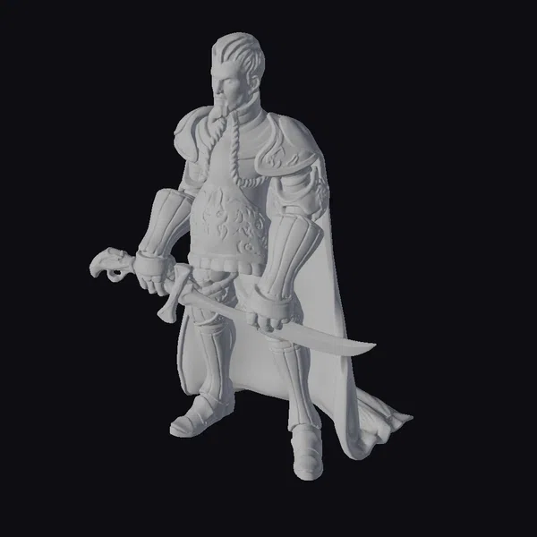 Standing tall with a strong, heroic posture, this armored knight showcases intricate details on his black, gold, and red armor, complete with a flowing cape and a sword at the ready. The stylized model captures a sense of fantasy and valor, making it perfect for projects requiring a medieval touch. Ideal for use in games, animations, or 3D printing, this model brings a sense of adventure and bravery to any scene.