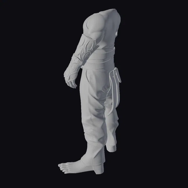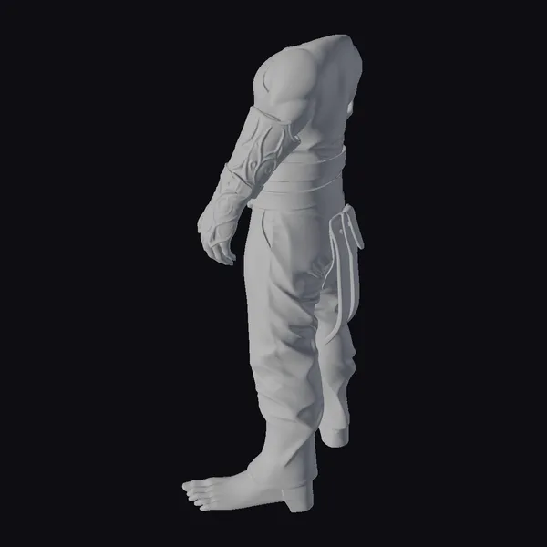 This 3D model showcases a meticulously crafted armored lower body suit, designed for a futuristic or sci-fi character. The suit itself is a combination of dark grey leather and bronze metallic parts, offering a blend of flexibility and protection. The model features a detailed metallic belt around the waist, a thigh armor piece on the right side, and armored coverings on the legs and one arm. The bronze accents add a touch of warmth to the otherwise cool-toned armor. The pose of the model, with the left leg barefoot and slightly extended forward, suggests a moment of action or transition. The level of detail in the textures, including the subtle reflections on the metallic parts, enhances the realism of the model. This model is ideal for use in games, 3D printing, VR/AR experiences, animation projects, and design visualizations where a futuristic armored character is needed.