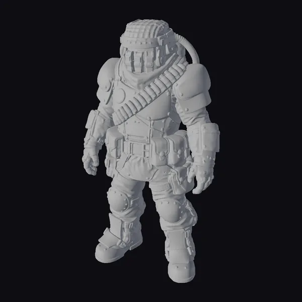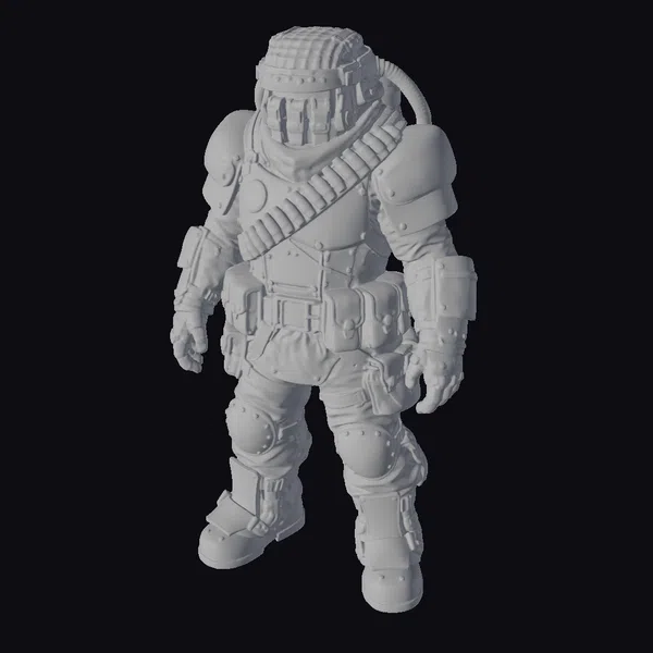 Standing tall with a robust build, this armored power suit is meticulously detailed with textures that suggest a blend of metal and industrial materials. The helmet, equipped with a visor, adds an air of mystery and protection. A belt loaded with ammunition and utility pouches hints at the suit’s readiness for action. The suit’s pose, with a slight forward lean, suggests mobility and readiness. Ideal for use in sci-fi games, animations, or designs that demand a futuristic, high-tech aesthetic, this model brings a sense of advanced technology and power.