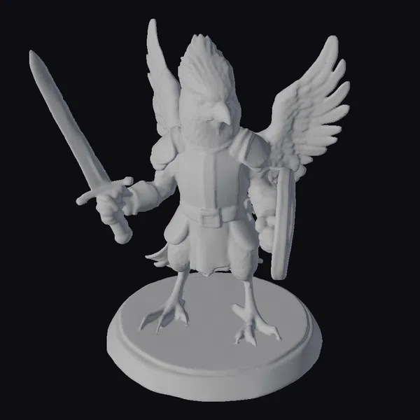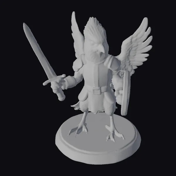 Standing proudly on a circular base that resembles worn stone, this magnificent red bird is a vision of fantasy bravery. Its body is adorned in detailed silver armor that covers its chest and shoulders, complemented by a brown belt and harness. The bird’s wings are spread wide, showcasing their full span, and its sharp, yellow beak is set in a resolute expression. Clutching a long sword in its right talon and a shield in its left, the bird appears poised for battle. The armor’s metallic sheen and the soft, feathery texture of the bird’s plumage are meticulously rendered, offering a feast for the eyes. This model is perfect for use in games, 3D printing, virtual reality experiences, animations, or as a striking piece of digital art.