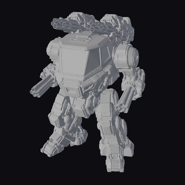 Perched atop this imposing mech’s body, a cluster of guns blaze with orange flames, hinting at the destructive power at its core. The robot’s body is a marvel of industrial design, with sharp, metallic edges and a weathered texture that suggests a storied history of battles fought and won. Its legs are sturdy and powerful, ending in heavy, treads that evoke a sense of unstoppable force. The cockpit, protected by reinforced glass, seems to be the mech’s only vulnerable spot, but even that appears robust enough to withstand significant punishment. This 3D model would be perfect for use in sci-fi games, animations, or designs that require a formidable robotic presence. Its level of detail and realistic texture make it suitable for high-quality renderings, from concept art to final product.