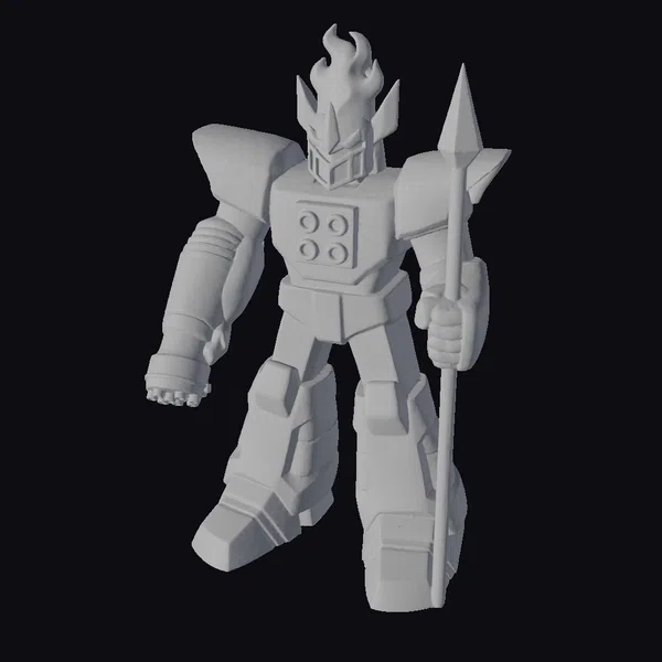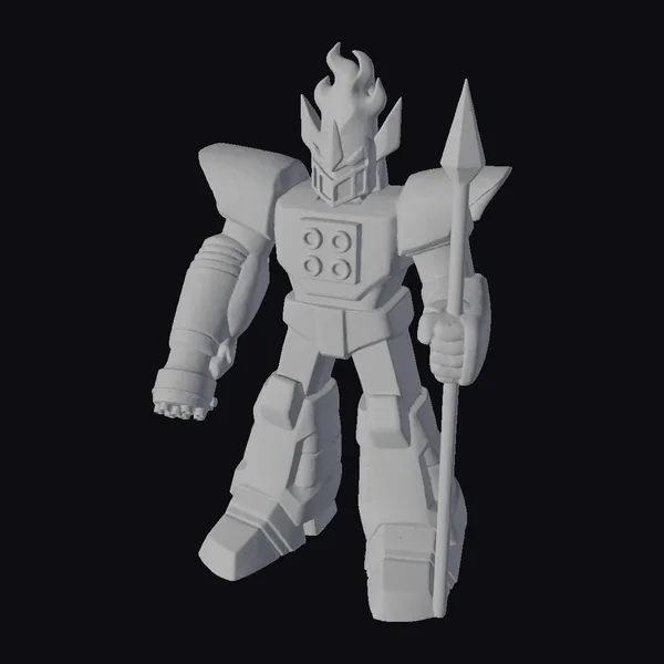 This imposing robot warrior stands ready for combat, its body composed of intricately detailed gray and green metallic plates that cover its torso, arms, and legs. A vibrant flame erupts from the top of its helmet, casting a fierce glow on its surroundings. The robot’s right arm is transformed into a robust cannon, suggesting a capability for heavy firepower. In contrast, its left hand firmly grips a long spear, its sharp tip angled menacingly. The combination of the robot’s armored physique, weaponry, and fiery aura creates a compelling image of a formidable fighter. Its design makes it an excellent choice for scenes requiring a strong, sci-fi presence, suitable for applications in games, 3D printing, VR/AR experiences, animation, and design projects.