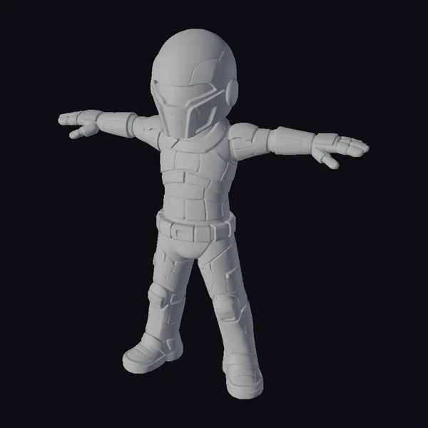 Detailed with precision, this 3D model showcases a futuristic armored character with a predominantly dark gray and black suit. The armor features extensive orange glowing accents on the joints, mask, and chest, suggesting advanced technology and power sources. The character’s pose, with arms outstretched and legs shoulder-width apart, conveys readiness and stability. The model’s proportions are well-balanced, fitting for various applications such as game development, animation projects, or virtual reality experiences. Its cartoonish yet detailed design makes it versatile for different creative ventures.